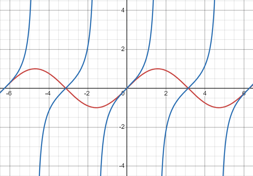 The graphs of y=tan θ and y = sin θ showing solutions when both tan θ =0 and sin θ=0