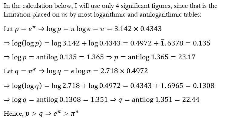 However, these transcendental numbers, precisely because they are not the result of any algebraic operations, do not lend themselves to easy comparison. A famous question, for example, asks which of eπ or πe is larger. Neither of these expressions is easy to evaluate. We could use logarithmic tables to reach the answer. This is shown below.