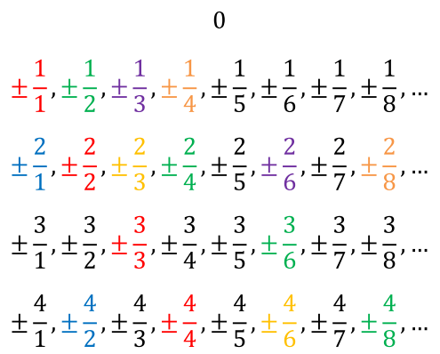 - that there will be no repetition of numbers that have different rational form but the same value (i.e. equivalent fractions).