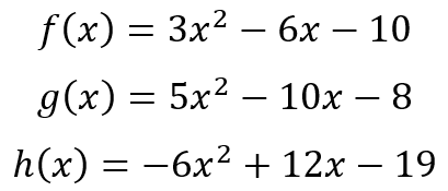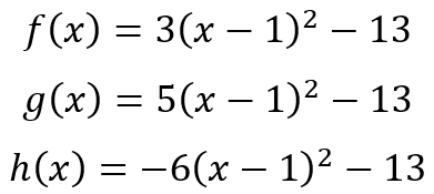 the fact that the vertices are at (1, -13) is indisputable. But more than that, the second set of equations also tell us, from the signs on the coefficients 3 and -13, 5 and -13, and -6 and -13, that f(x) = 0 and g(x) = 0 will have real roots, while h(x) = 0 will only have complex roots.