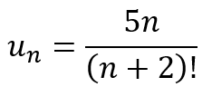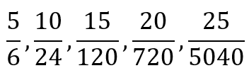 Right away, you will recognize that there is a pattern. The numerator is composed of multiples of 5, while the denominator is composed of factorials, starting with the factorial of 3. If I asked you to give me a formula for generating the terms, you will quickly be able to tell me: