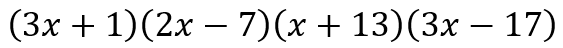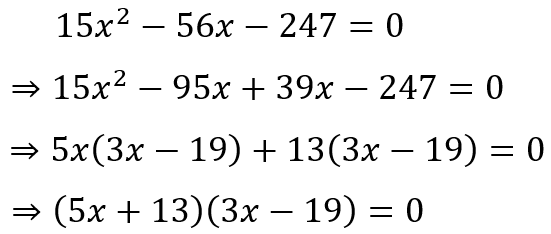 With a little effort, I can determine that the divisors of 3705 are 1, 3, 5, 13, 15, 19, 39, 57, 65, 95, 195, 247, 285, 741, 1235, and 3705. I can place them in pairs as follows: (1, 3705), (3, 1235), (5, 741), (13, 285), (15, 247), (19, 195), (39, 95), and (57, 65), where the numbers in each pair gives the product of 3705. Now since I have -3705 and not 3705, I need two numbers of opposite signs. And since I have -56 and not 56, I need the number with the larger magnitude to be negative. This gives the pair of numbers to be 39 and -95. Now we can proceed to split the middle term and factorize, giving