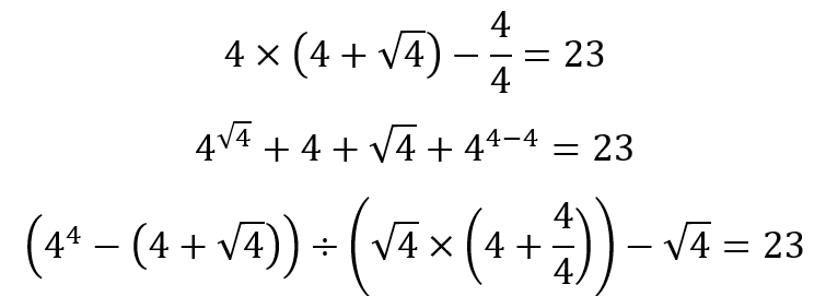 There are infinitely many ways in which I can use just the number 4 and obtain 23. The challenge would be for each student to give a unique set of operations. And when I have done this exercise, never once have we needed to repeat a set of operations.