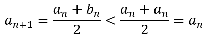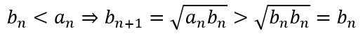 This means that the sequence bn is steadily (monotonically) increasing while the sequence an is steadily (monotonically) decreasing. Since we start with the fixed values of a0 and b0, this means that the two sequences will necessarily converge.