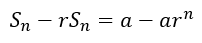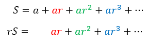 Note that the nth term is arn-1 because the first term, a, is actually ar0 and as the power of a starts from 0, the count after n terms will be n – 1. We can multiply the above equation by r and arrange a similarly color coordinated set of two equations one below the other as follows