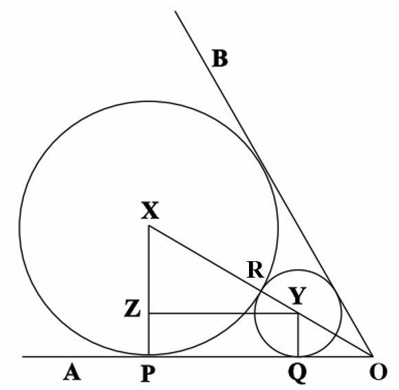 Here, X and Y are the centers of the larger and smaller circles respectively. XP and YQ are perpendiculars drawn from X and Y respectively to AO. YZ is a perpendicular drawn from Y to XP. Since we were given that the largest circle has a radius of 1, this means that XP = 1. Also, R is the point of tangency of the two circles, which is also the point where the line OX intersects both circles.