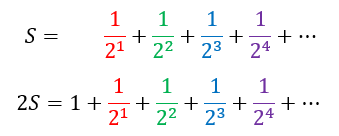 We can see that, if we subtract the first equation from the second, the LHS will yield Sn, while the RHS will reduce to 1 since all the terms in red, green, blue, and purple will cancel out. This gives us S = 1.