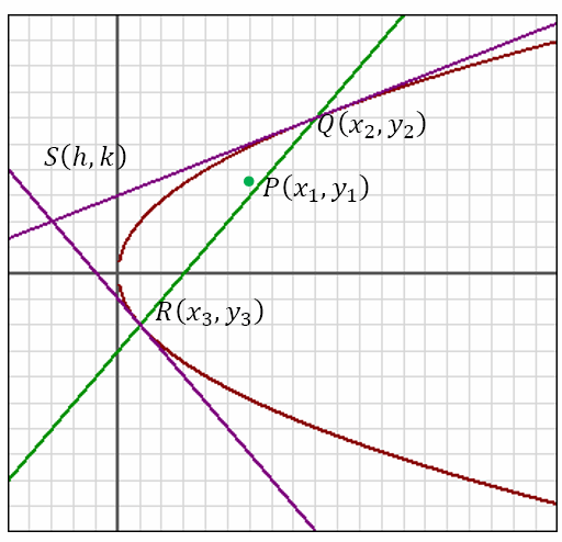 It is clear that at the line pivots about P, the points of intersection, Q and R, of the line with the parabola will vary. This means that the tangents at Q and R will vary. Hence, the point S where the two tangents intersect will move. The locus (fanciful name for ‘path’) of S is known as the polar of P with respect to the parabola and P is known as the pole of the polar with respect to the parabola. It can be seen from the diagram that QR is the chord of contact of S wrt the parabola. Hence, its equation should be yk = 2a(x + h). However, P lies on QR. Hence, y1k = 2a(x1 + h). Generalizing, we obtain the locus of S to be yy1 = 2a(x + x1).