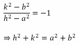 This is a quadratic equation in m and if the tangents through P intersect at right angles then the product of the slopes of the tangents would be -1. From what we know concerning quadratic equations, this means that the constant term divided by the coefficient of x2 must be -1. Hence,