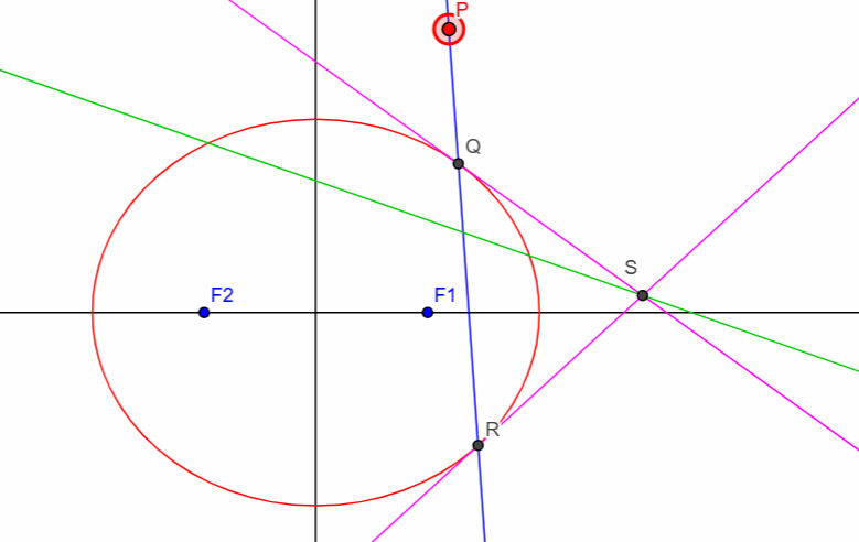If you wish to see how the chord of contact, pole and polar relate to an ellipse, you can click here for a Geogebra App that I created. With the checkbox on the top left unchecked, you can see how the chord of contact varies. Just click on the point P and drag it around! If you check the checkbox on the top left, you can explore how the pole and polar vary. Again, just click on the point P and drag it around to position the pole. I have made the line rotate automatically. This changes the positions of Q and R automatically and, therefore, the bright pink tangents at those two points. The point of intersection of these two tangents will move, tracing the green line, which is the polar.