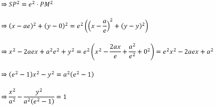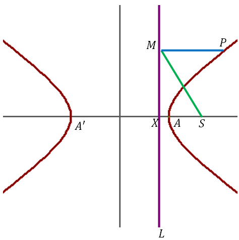 Let P(x, y) be any point on the hyperbola. Let M be the foot of the perpendicular from P onto L. Then the coordinates of M are (a/e, y). Then by definition of the hyperbola SP = e⋅PM.