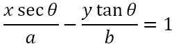 Consider a point P on the hyperbola x2/a2 – y2/b2 = 1. See the figure on the left below. Let the perpendicular to the transverse axis of the hyperbola (here the x axis) meet the transverse axis at the point Q. Let R be the point of contact of the tangent from Q onto the auxiliary circle. θ, the eccentric angle of P is the angle made by radius OR with the positive x axis. Now OR = a ⇒ OQ= a secθ ⇒y =b tanθ ⇒ P ≡ (a secθ, b tanθ), which are the parametric coordinates of the point on the hyperbola with eccentric angle of θ.