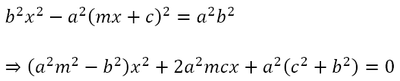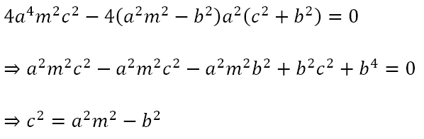 If the line is a tangent to the hyperbola, the above quadratic equation should have a repeated root, meaning that its discriminant must be zero. Hence,