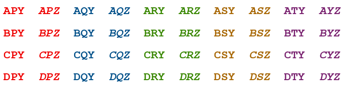 As promised, let us begin with the two earlier examples, which are relatively easy. Suppose we label the starters as A, B, and C, the main courses as P, Q, R, S, and T, and the desserts as Y, and Z. The possible choices are listed below: