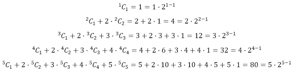 What we have seen in this post is that we can use logical arguments to obtain relationships between binomial coefficients. We can also use simple algebra and calculus to obtain other relationships. As seen in the last example, we can multiple (1 + x)n by other terms to obtain further identities. The results are quite obviously endless. For example, I leave the reader to attempt to prove that