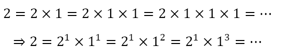 The fundamental theorem of arithmetic states that every natural number greater than 1 is either a prime number or can be expressed as a unique product of prime numbers, disregarding the order of the primes. We must admit that this theorem, like many in mathematics, is a kind of after-thought. It was introduced specifically to exclude 1 from the set of primes. And this is because including 1 in the set of primes creates more problems than it solves. This is because 1 is the multiplicative identity element. That is, the product of any number and 1 is the number itself. This means that, if we allow 1 to be defined as a prime number, we could write