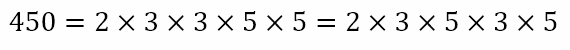 ways of permuting these prime factors. However, all of them give the product of 450. Hence, if we disregard the order in which we multiply the prime factors, the prime factorization of 450 is unique and can be written as