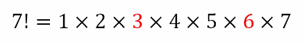 It is clear that only the numbers in red allow a division by 3. And there are two such numbers. Since we are dividing by 3, we can realize that every third number will be a multiple of 3. Hence, since we are dealing with 7!, and 7 ÷ 3 = 2 ⅓, we can conclude that there will be two multiples of 3 from 1 to 7. Hence, the exponent of 3 in 7! is 2.