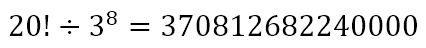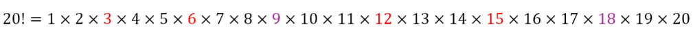 Once again, the numbers in red allow a division by 3. However, the numbers is purple allow for a division by 9, that is 32. Here we can see that every third number is a multiple of 3 and every ninth number is a multiple of 9. This is obvious. Since 20 ÷ 3 = 6 ⅔, there will be 6 multiples of 3 from 1 to 20. And since 20 ÷ 9 = 2 ²⁄₉, there will be 2 multiples of 9 from 1 to 20. Since each multiple of 9 contributes another factor of 3, this means that the exponent of 3 in 20! will be 6 + 2 = 8. We can check this an perform