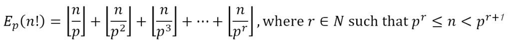 In the previous post in the series on Counting Principles, we looked at the technique of partitions. I concluded with the promise to deal with the exponent of prime p in the number n!. And you may be wondering what in the world that means. First, let us remind ourselves what n! denotes. Read ‘n factorial’, it is defined as the product of all natural numbers up to and including n. Hence, 2! = 1 × 2, 5! = 1 × 2 × 3 × 4 × 5, etc.