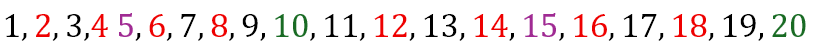 So, how many zeroes are there at the end of 100!? Now, a zero at the end of a number indicates a multiple of 10. So we are trying to determine the exponent of 10 in 100!. However, 10 = 2 × 5. Moreover, for every multiple of 5, we have at least 2 multiples of 2. See the figure below, where numbers in red are multiples of 2 but not 5, numbers in purple are multiples of 5 but not 2, and numbers in green are multiples of 2 and 5.