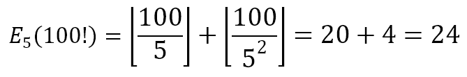 This means that there are 24 zeroes at the end of 100!. Indeed, we can use a computational engine and determine that